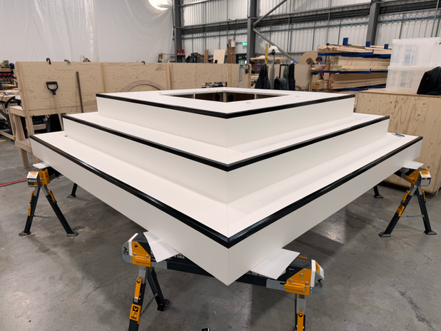 The first game involved a button on a plinth which sat on a set of steps. We had two of these made. I finished the steps off with a black vinyl detail all the way around. I also covered the two button plinths in a matt white vinyl.